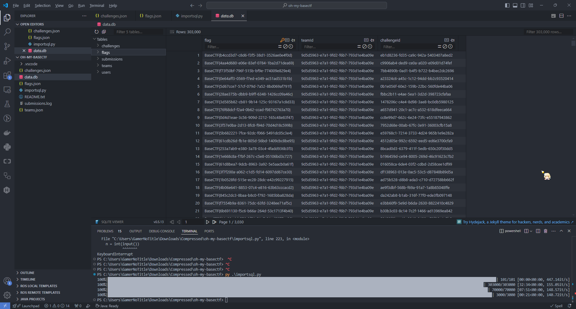 if __name__ == "__main__": importChallenges("challenges.json") importFlags("flags.json") importSubmissions("submission.log") importTeamsAndUsers("teams.json")经过了大约40分钟,数据就成功导入到sqlite数据库了
