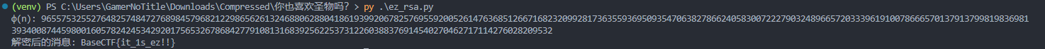 # 将解密后的长整型数转换为字节 flag_bytes = long_to_bytes(m) print("解密后的消息:", flag_bytes.decode())else: print("无法计算私钥 d。")