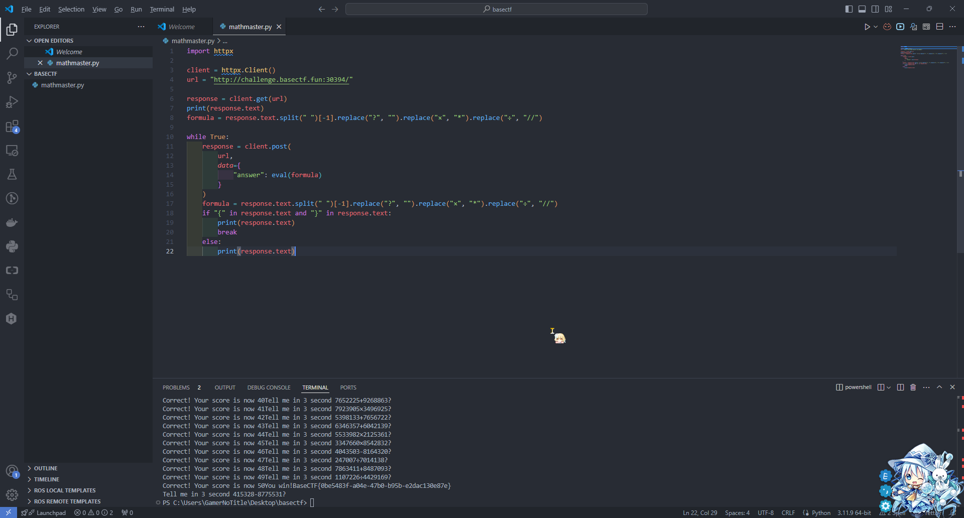 while True: response = client.post( url, data={ "answer": eval(formula) } ) formula = response.text.split(" ")[-1].replace("?", "").replace("×", "*").replace("÷", "//") if "{" in response.text and "}" in response.text: print(response.text) break else: print(response.text)