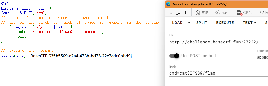 然后把它cat出来就可以了,cat这里我用的是第二种表示方法,即$IFS$9