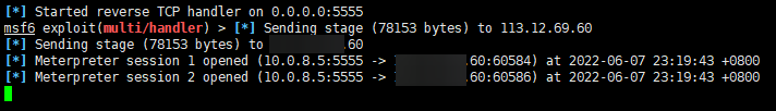 这样就算是运行了,然后我们打开安装的软件,我们的msfconsole会提示肉鸡上线