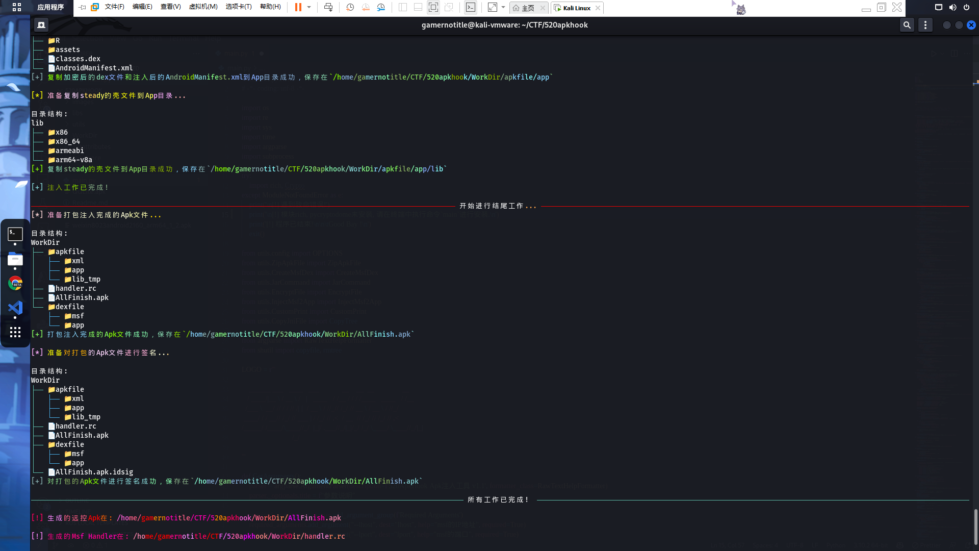 [!] 生成的Msf Handler在: /home/gamernotitle/CTF/520apkhook/WorkDir/handler.rc也就是说handler.rc文件已经为我们写好了在msfconsole里面运行的命令