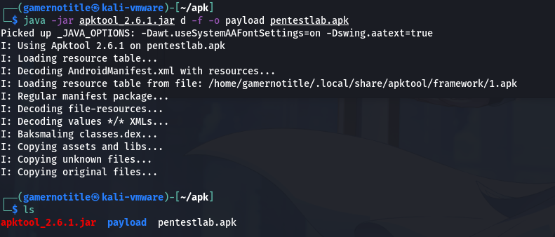 ┌──(gamernotitle㉿kali-vmware)-[~/apk]└─$ java -jar apktool_2.6.1.jar d -f -o payload pentestlab.apkPicked up _JAVA_OPTIONS: -Dawt.useSystemAAFontSettings=on -Dswing.aatext=trueI: Using Apktool 2.6.1 on pentestlab.apkI: Loading resource table...I: Decoding AndroidManifest.xml with resources...I: Loading resource table from file: /home/gamernotitle/.local/share/apktool/framework/1.apkI: Regular manifest package...I: Decoding file-resources...I: Decoding values */* XMLs...I: Baksmaling classes.dex...I: Copying assets and libs...I: Copying unknown files...I: Copying original files...